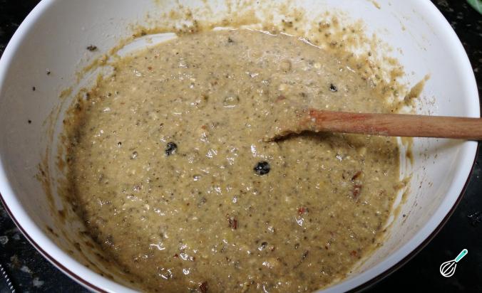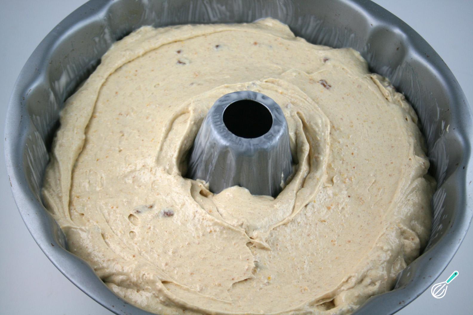Finalmente acrescente as nozes e as uva-passa e misture. À parte bata as claras de ovo em neve e incorpore na massa do bolo de nozes, com movimentos delicados para que não perca o ar.