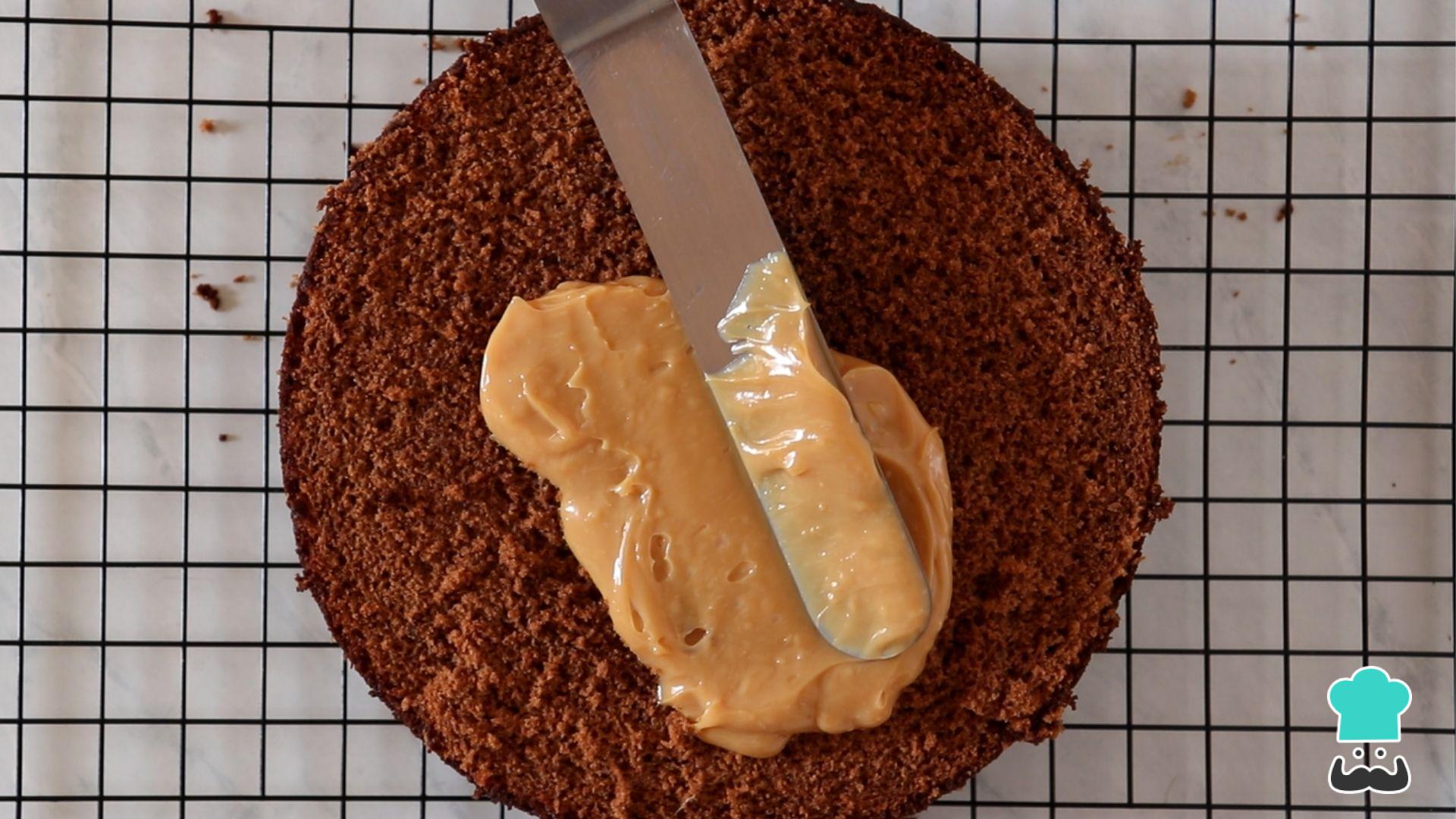 Espalhe o recheio de doce de leite (leite condensado cozido) numa das metades do bolo.