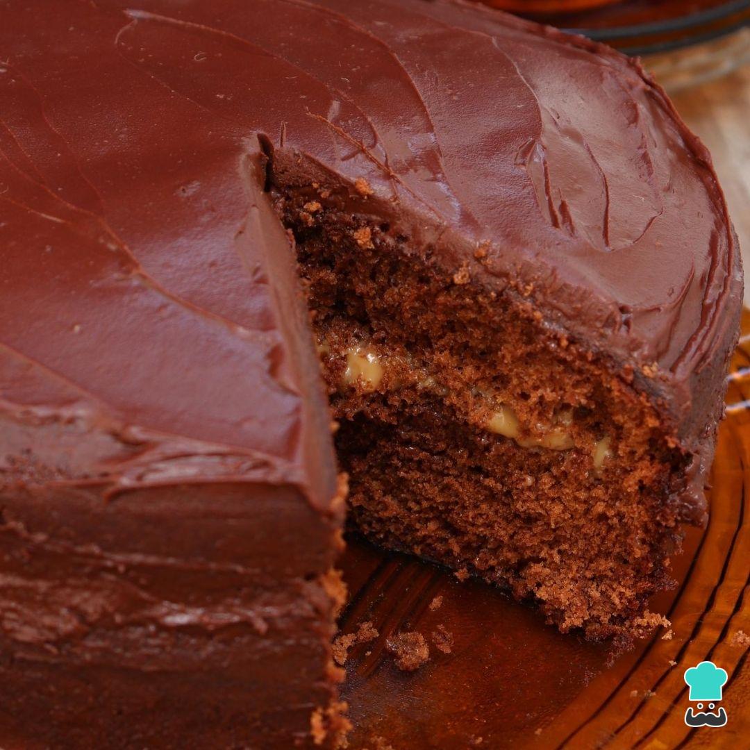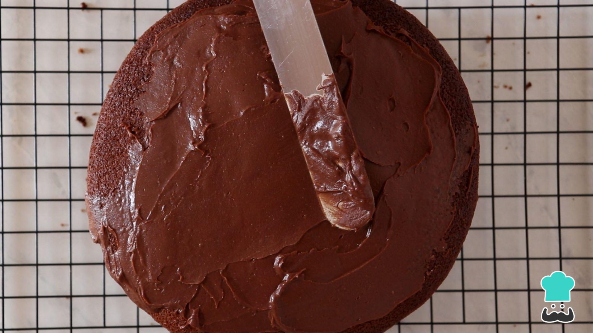 Coloque a outra parte da massa de volta ao bolo e cubra com a ganache de chocolate e creme de leite.