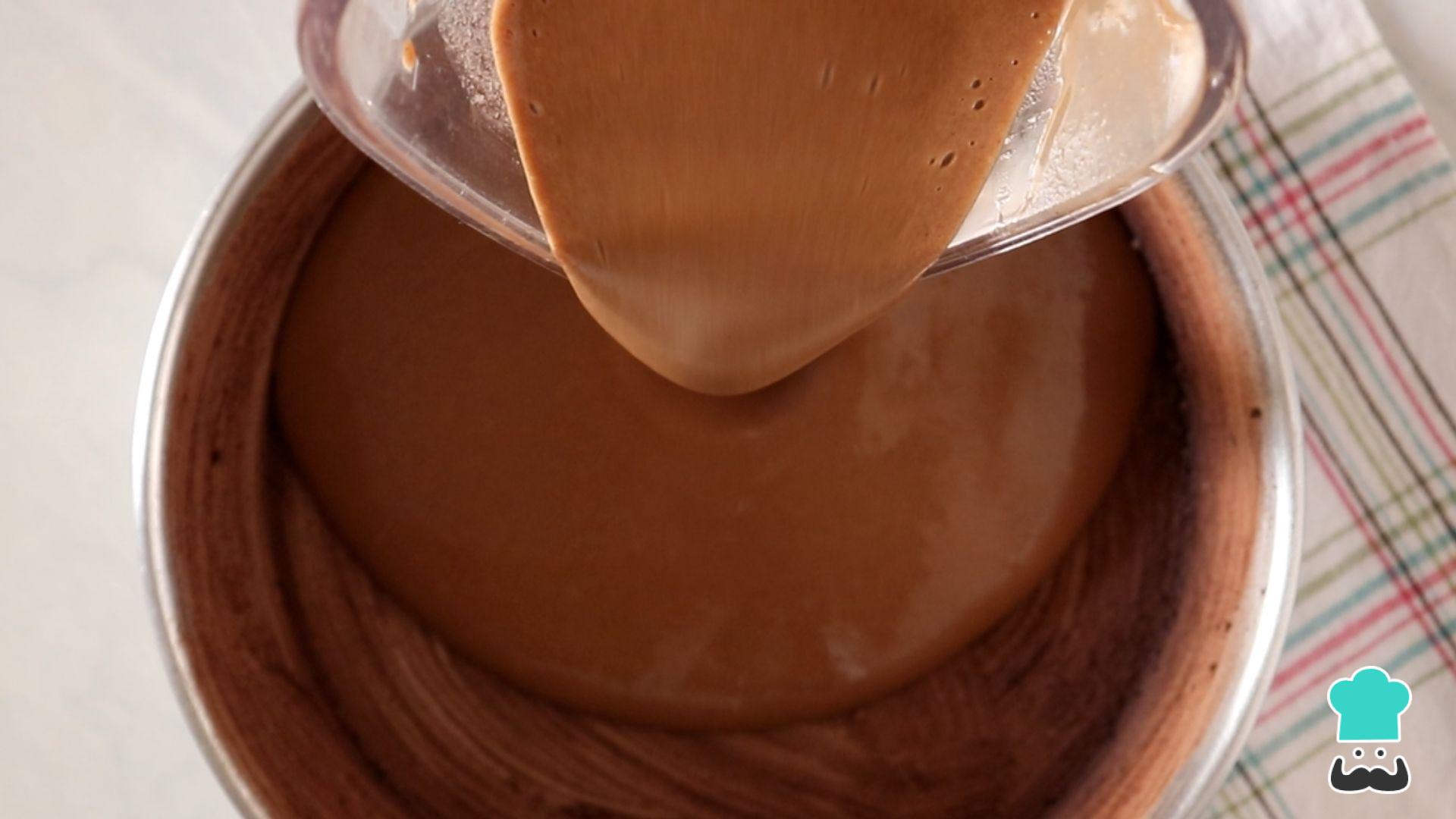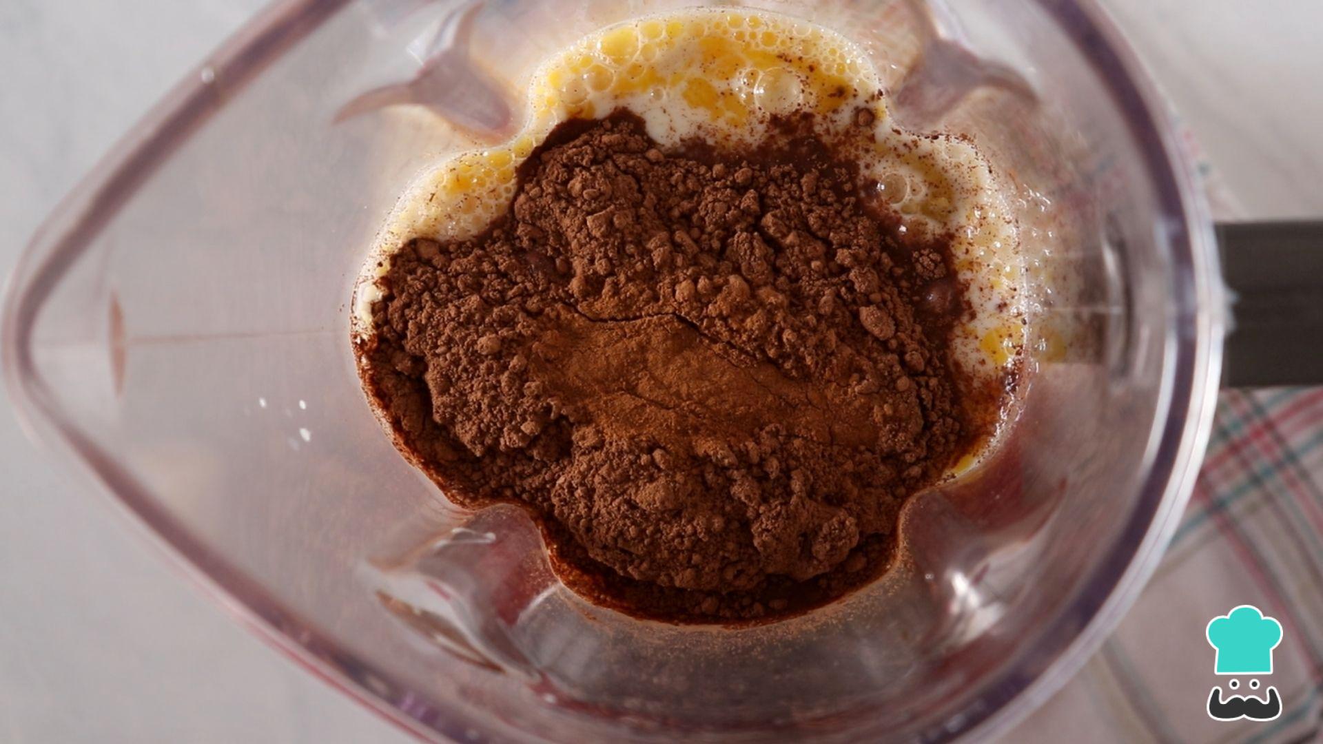 Coloque os seguintes ingredientes no liquidificador: ovos, leite condensado, leite integral (coe o leite antes de colocá-lo no liquidificador), mel, açúcar mascavo, cacau em pó e canela em pó. Bata até ficar uma mistura lisa e homogênea.