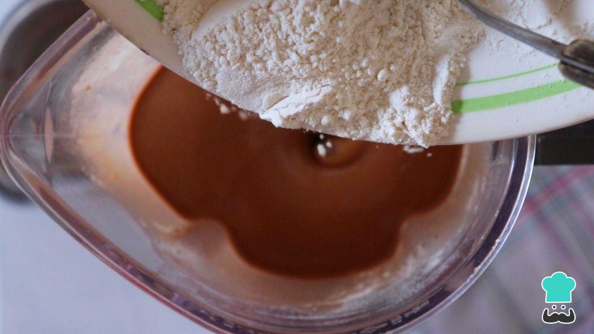 Em seguida diminua a velocidade do liquidificador e misture a farinha de trigo aos poucos. Por fim coloque o fermento e o bicarbonato e misture levemente.