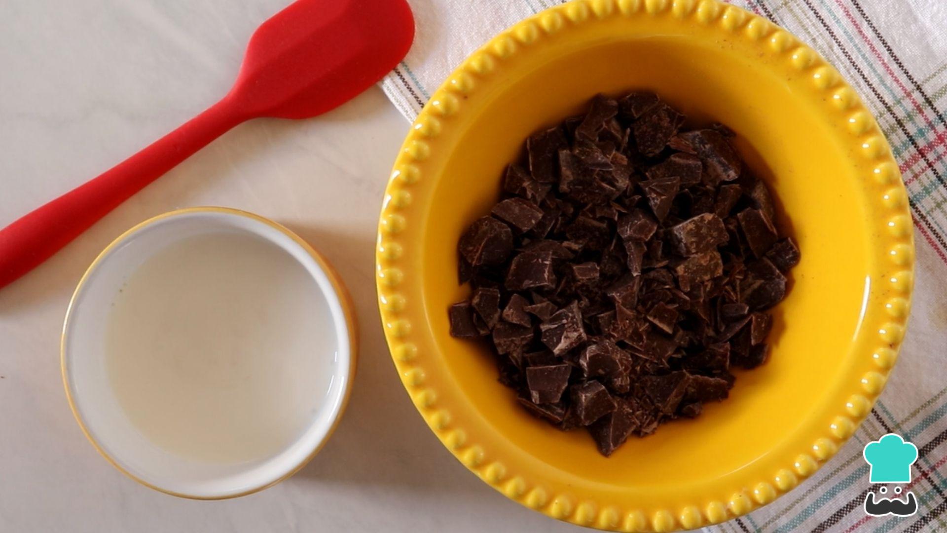 Enquanto o bolo assa prepare a ganache do bolo pão de mel caseiro: pique o chocolate bem fininho e aqueça o creme de leite (pode ser no fogão ou no microondas mesmo). Despeje o creme de leite aquecido no chocolate e mexa até derretê-lo por completo.