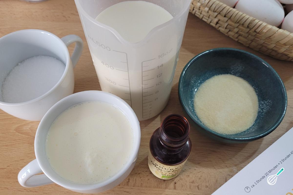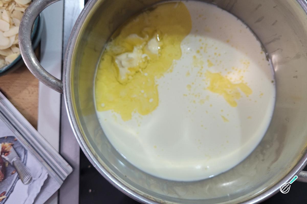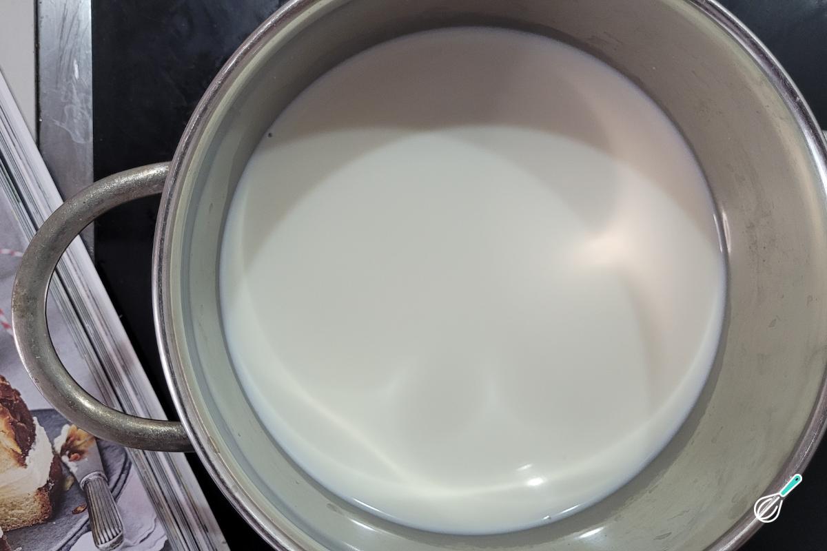 O recheio será feito em duas etapas. Na primeira, comece colocando cerca de 300 ml do leite em uma panela para esquentar com o açúcar e o extrato de baunilha. É importante não deixar ferver o leite.