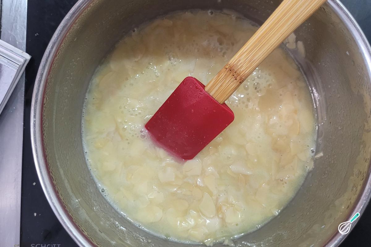 Desligue o fogo, adicione as amêndoas laminadas e reserve.