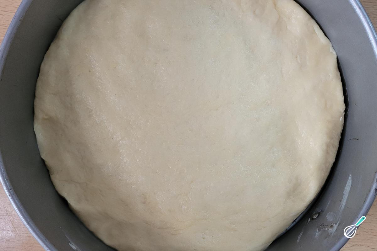 Quando a massa tiver dobrado de tamanho, transfira para uma forma de bolo levemente untada com manteiga (prefiro usar uma forma de fundo removível para ser mais fácil desenformar) e deixe crescer por mais uns 20 minutos.