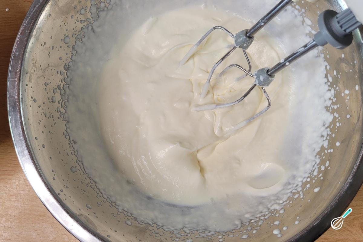 Enquanto isso, finalize o recheio. Bata o creme de leite fresco até formar chantilly. Depois misture com a mistura de gelatina até formar um creme bem espesso.