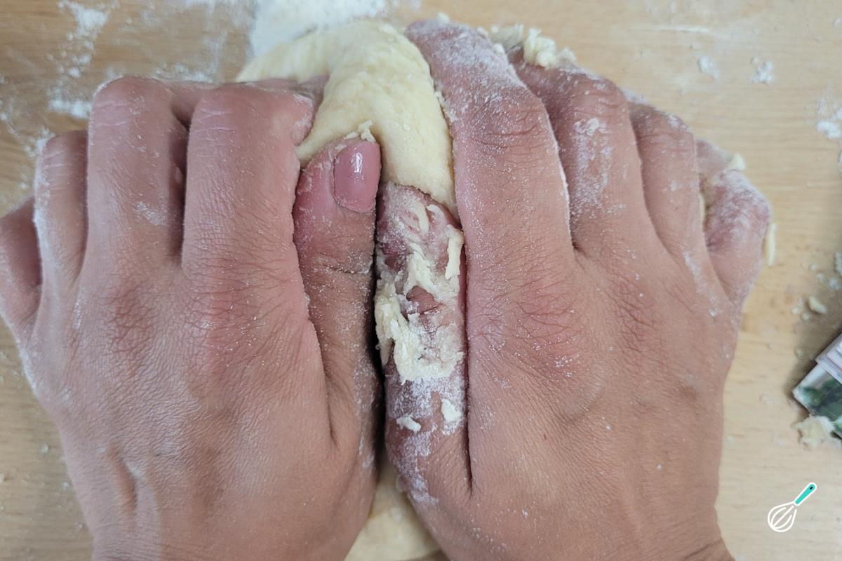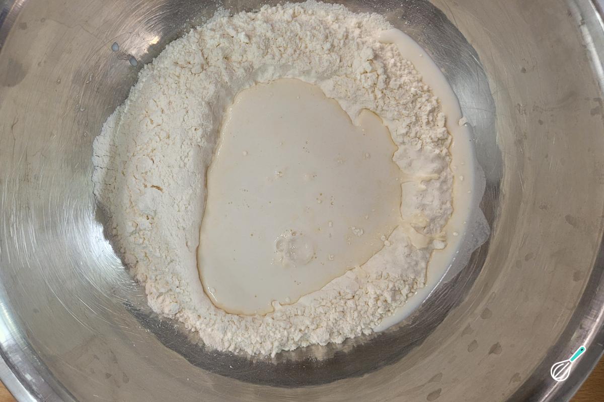 Comece misturando com uma colher e depois misture com as mãos, até que toda a farinha da tigela tenha sido incorporada. Se a massa estiver muito seca, coloque um tiquinho mais de leite.