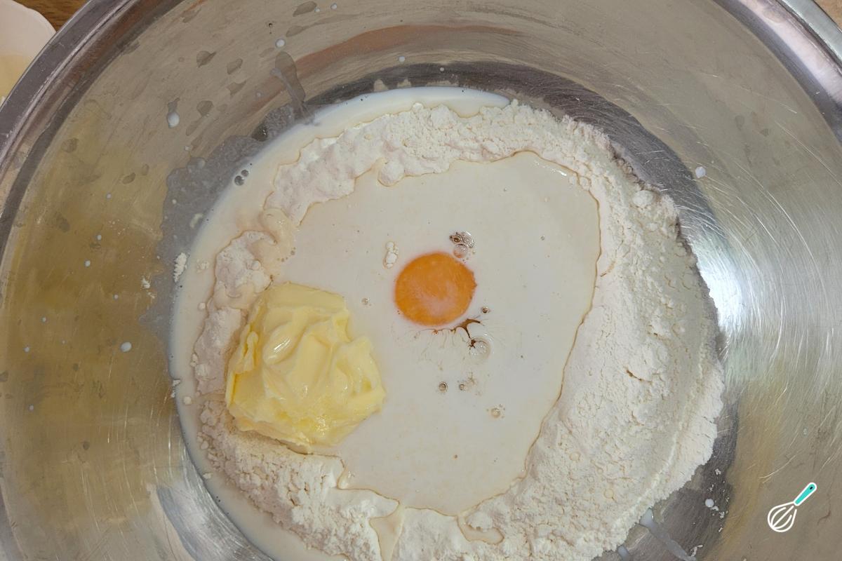 Em uma tigela grande, coloque a farinha, o açúcar, 1 pitada de sal e misture. Abra uma cavidade no meio e adicione a mistura de fermento e leite.