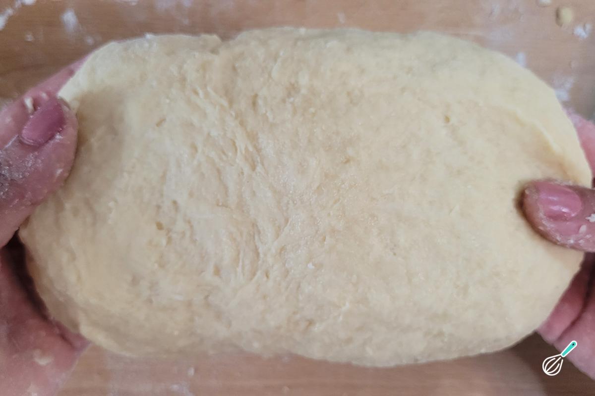 Caso esteja muito mole grudando demais, coloque mais farinha, mas sempre bem aos pouquinhos. Transfira a massa para a bancada enfarinhada e sove por uns 5-8 minutos, adicionando mais farinha caso seja necessário.