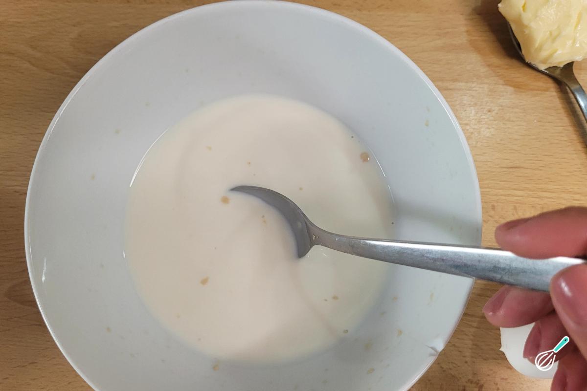 Comece fazendo a massa. Coloque o leite com o fermento em uma tigela. Misture bem para dissolver o fermento e reserve por uns 5 minutos até que comece a formar bolhas, indicando que a mistura até ativa.