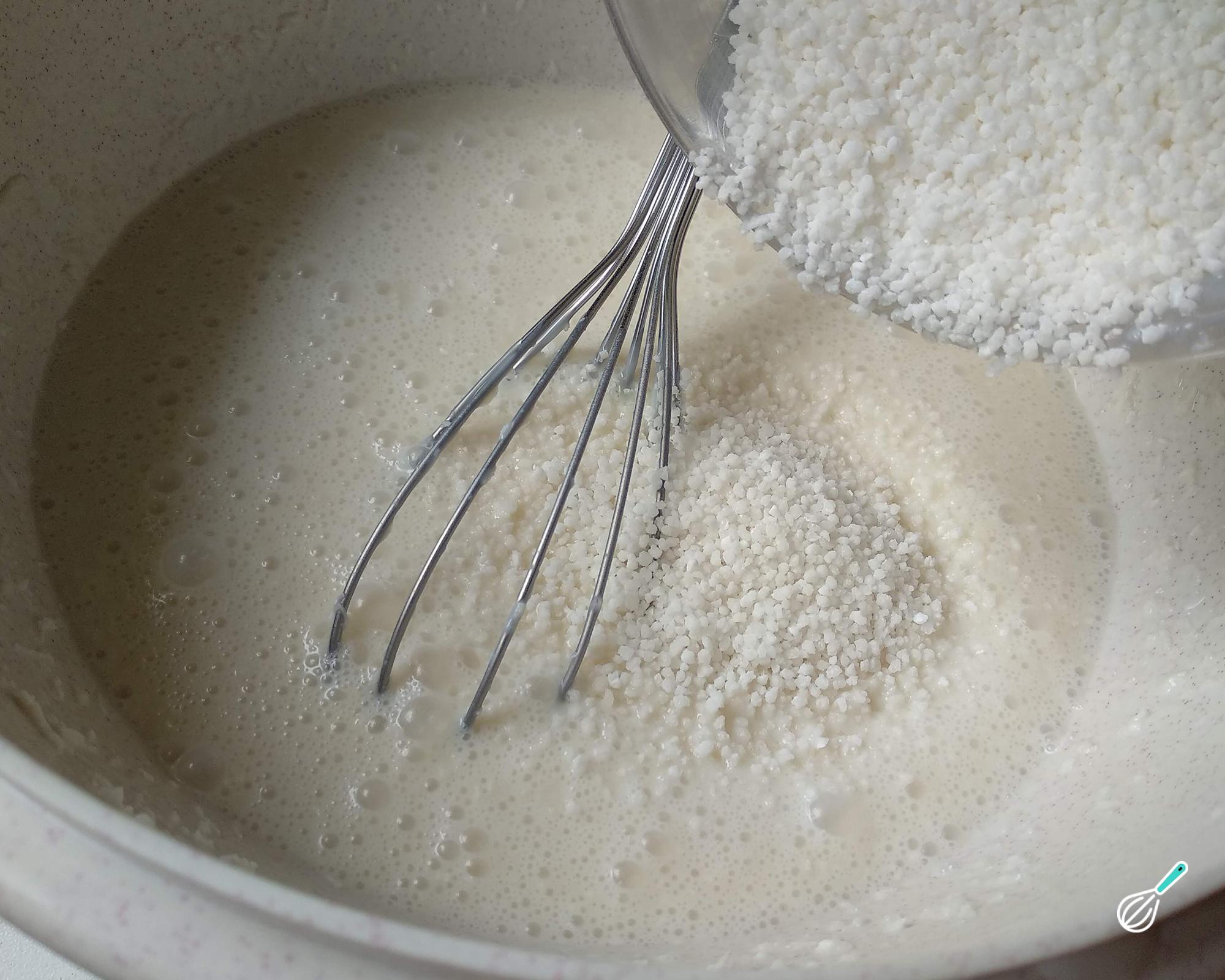Em uma tigela misture o leite integral com o leite de coco, a tapioca, o açúcar, o coco ralado e metade da lata de leite condensado. Mexa bem com uma colher ou, se preferência, com um batedor de arames (como na foto).