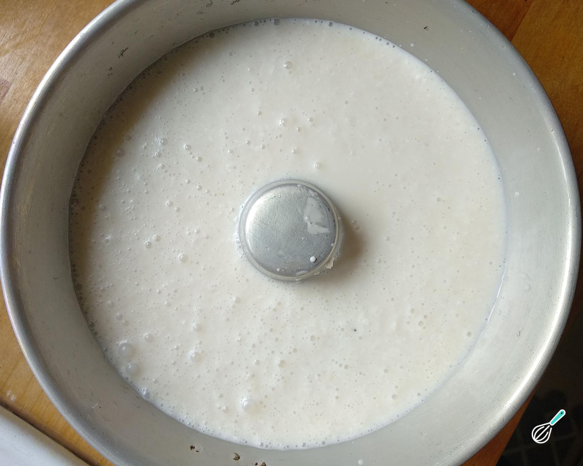 Coloque a mistura do bolo podre em uma forma untada com manteiga ou óleo e reserve na geladeira por 1 hora. Durante esse tempo a tapioca vai absorver os líquidos e o resultado será uma sobremesa de tapioca com consistência de pudim.