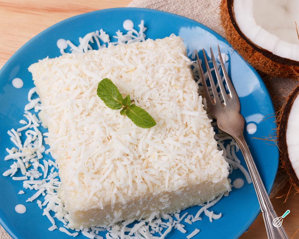 Após a refrigeração desenforme o bolo podre de tapioca. Sirva polvilhado com coco ralado e, se quiser, regue também com leite condensado. Bom apetite!