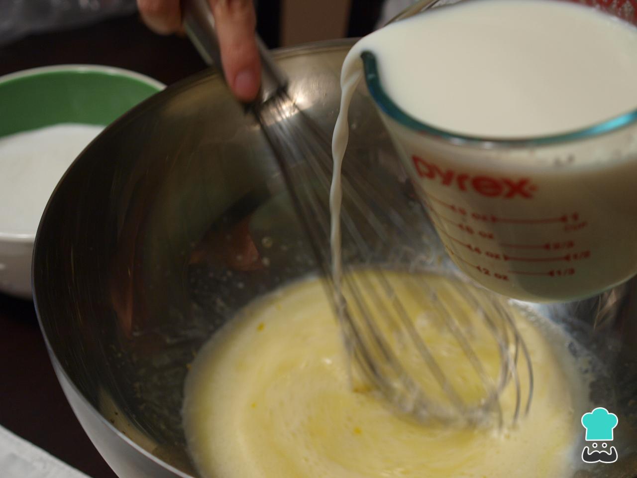 Para fazer esta receita de bolo português comece por bater os ovos e adicionar-lhes o leite, a cerveja, o mel, o vinho da Madeira, a manteiga e a banha derretidas.