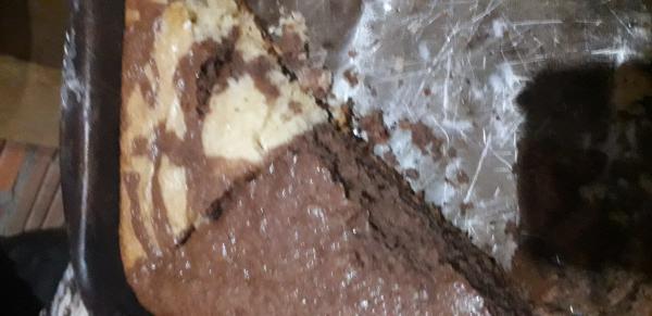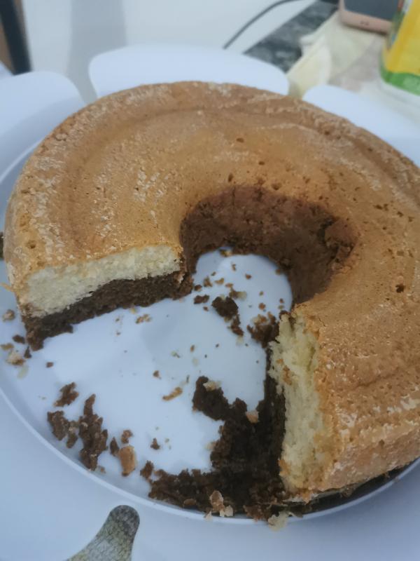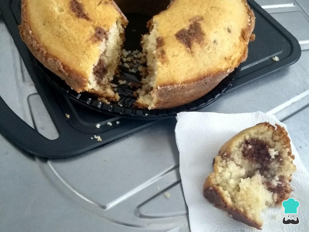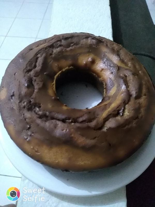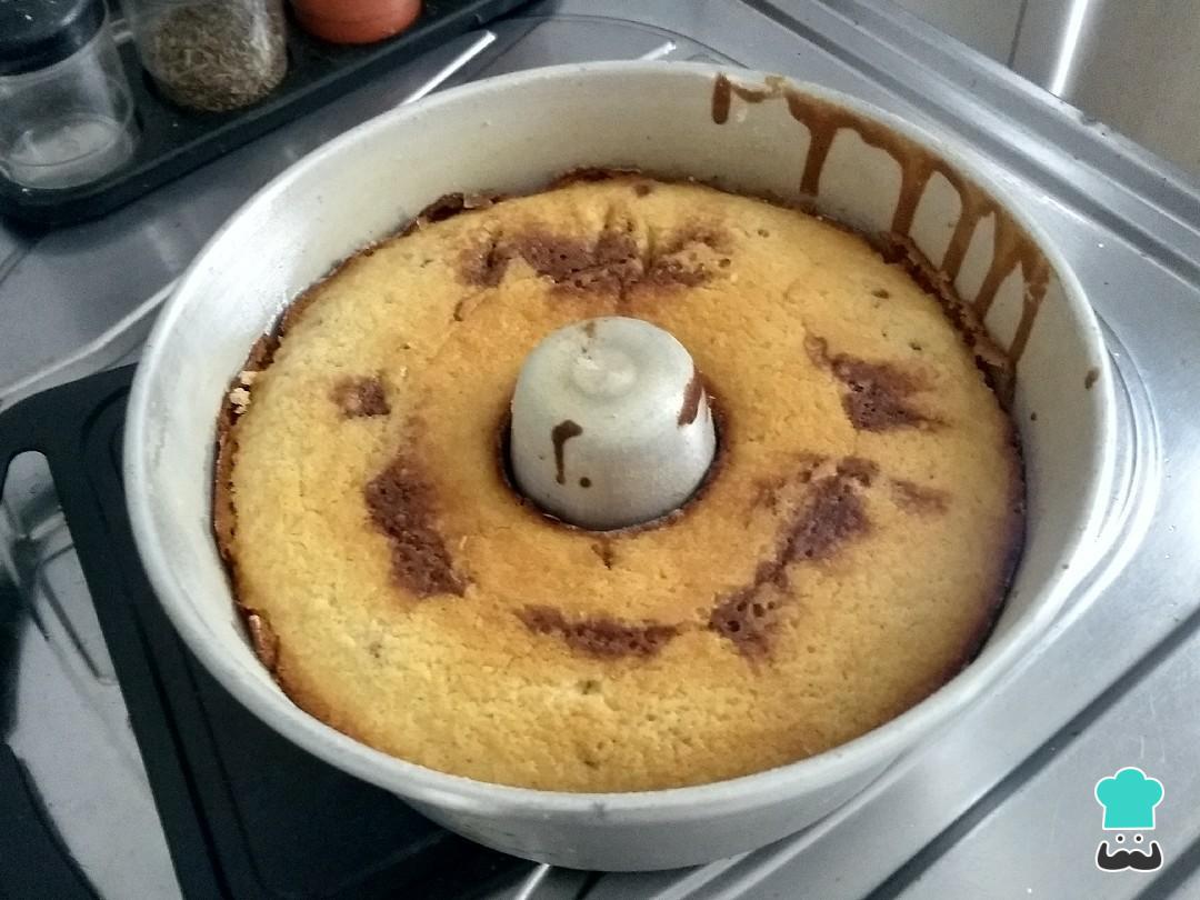 Unta uma forma do bolo com manteiga e polvilhe farinha de trigo. Na forma coloque metade da massa sem chocolate/cacau, depois acrescente a massa com chocolate/cacau e cubra com a massa restante. Coloque assando no forno a 180ºC por 30-35 minutos.