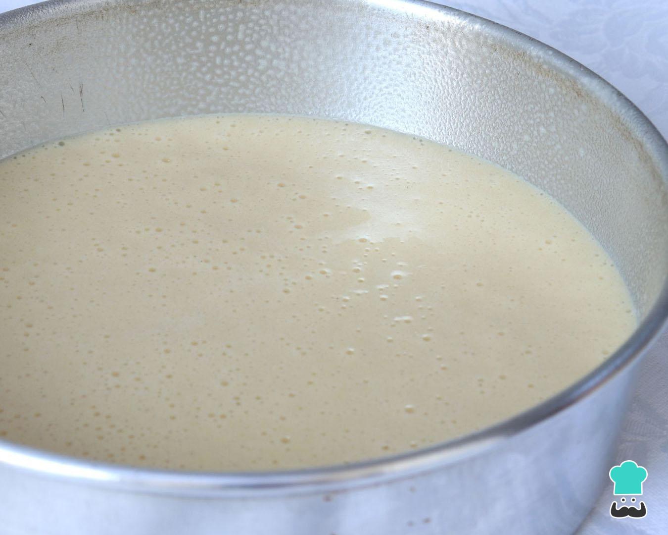 Unte e enfarinhe uma forma média (de 22-24 cm) e coloque a massa deste bolo simples sem ovo. Leve para assar no forno a 180ºC por 30-40 minutos ou até passar no teste do palito.