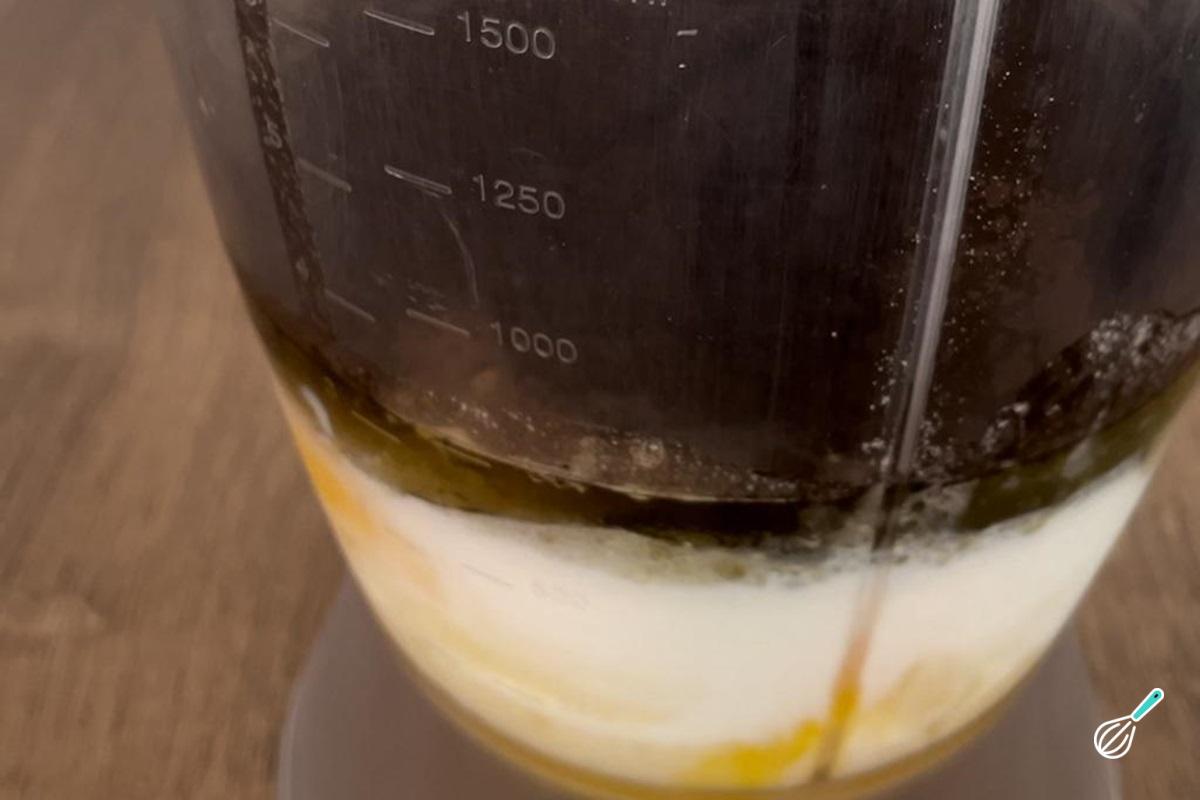 Bata tudo por uns 2 minutos até obter uma mistura homogênea. Adicione a farinha de trigo e o fermento em pó no liquidificador e bata ligeiramente, até que todos os ingredientes estejam incorporados.