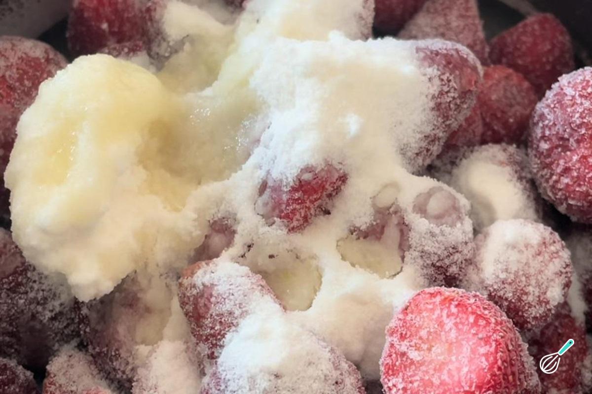 Numa panela, adicione os morangos congelados, o açúcar, o suco do limão e mexa bem.