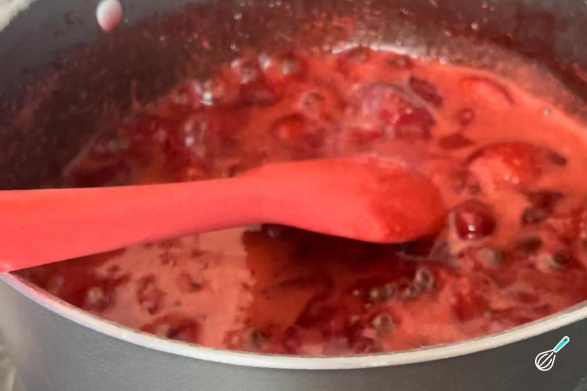 Leve ao fogo baixo, por uns 10 minutos para cozinhar, amassando os morangos para ficar em pedaços menores. Reserve.