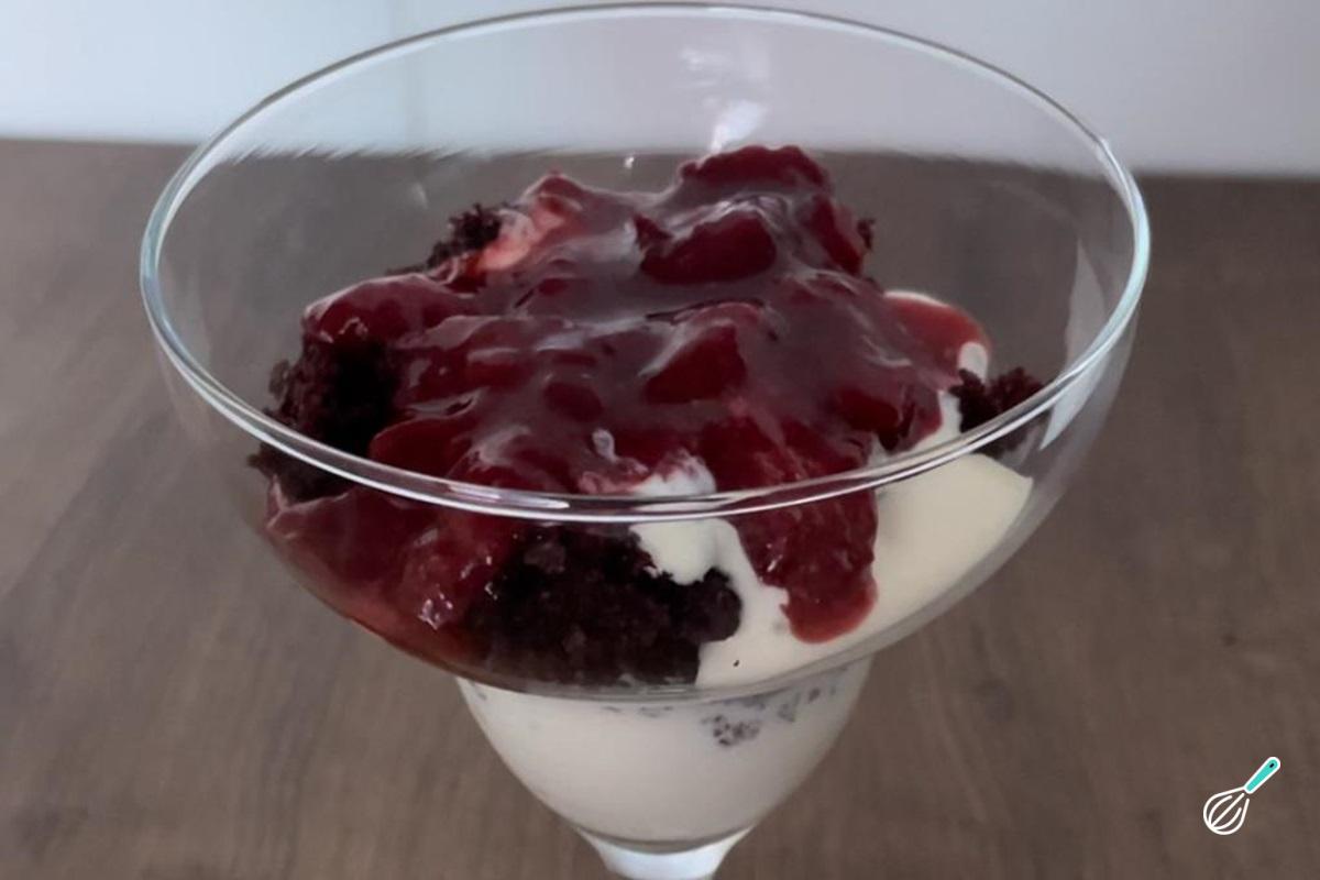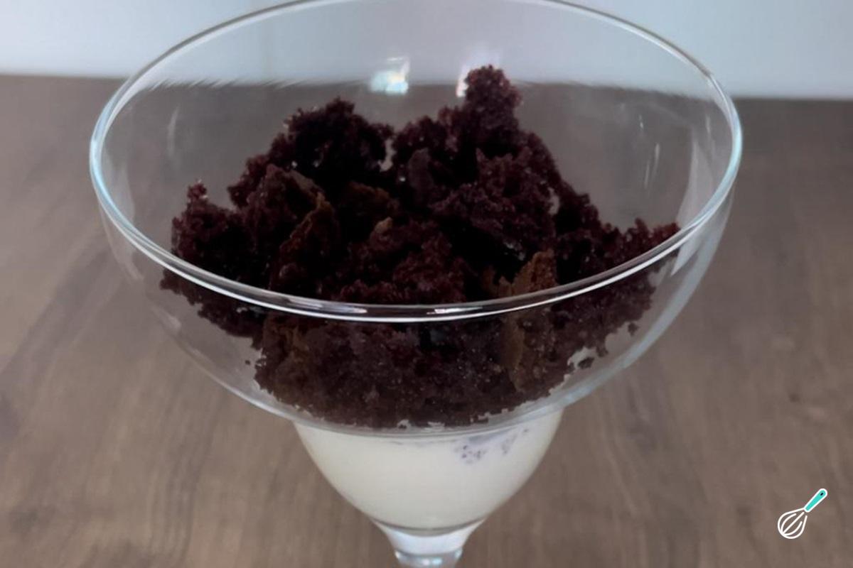 Com todos os ingredientes prontos e frios, comece a montagem na taça com o creme branco. Esfarele um pedaço do bolo e adicione na taça.