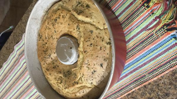Após o tempo indicado, retire do forno seu bolo salgado fácil e espere esfriar para desenformar. Sirva este salgado de forno fatiado e acompanhado de uma saladinha. Bom apetite!