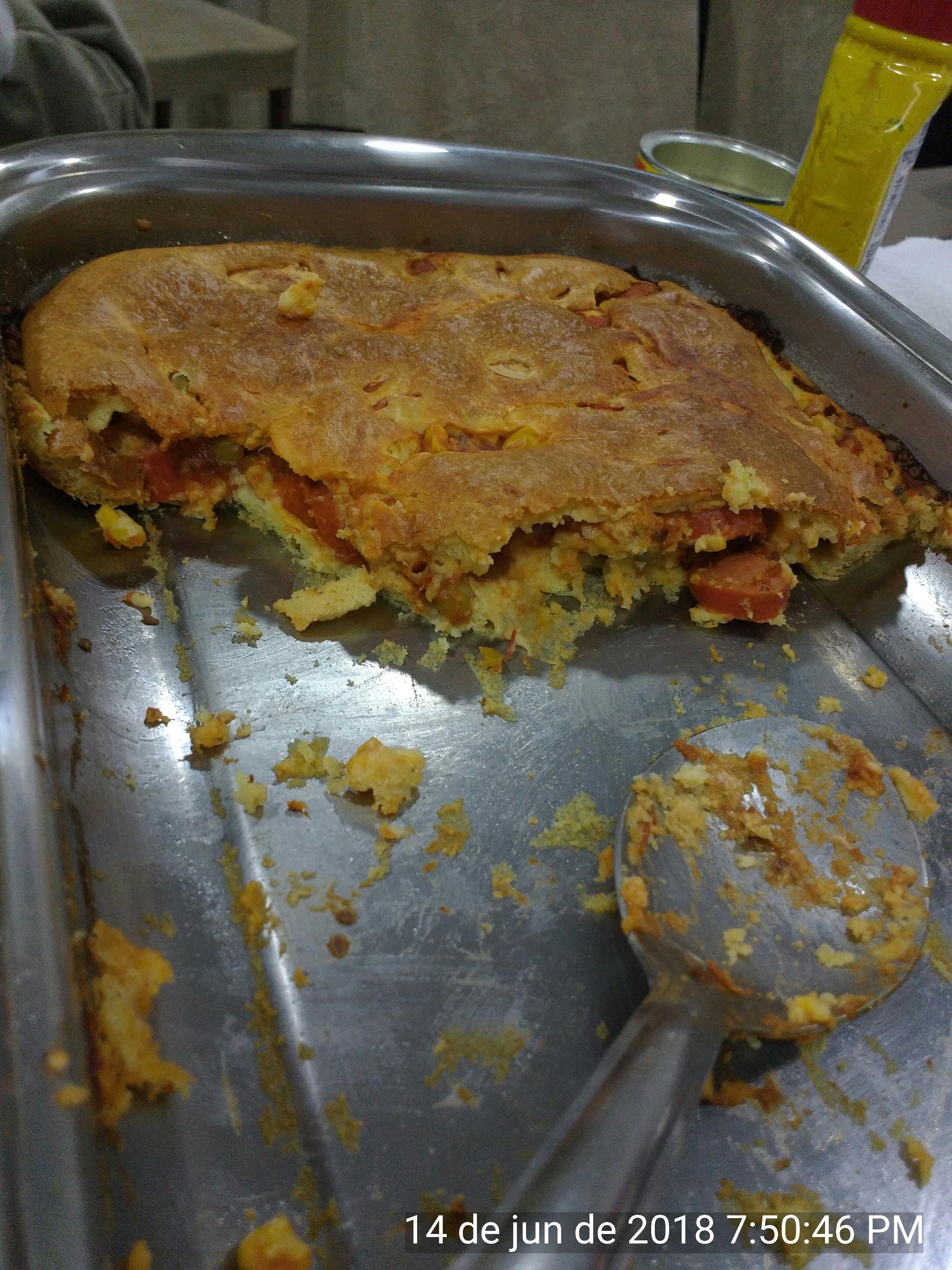 Numa forma de bolo ou assadeira untada e enfarinhada verta metade da quantidade da massa. Sobre ela polvilhe os ingredientes do recheio, que podem ser os que indicamos na lista de ingredientes ou outros da sua preferência, como frango desfiado e temperado fácil com requeijão, por exemplo.