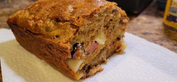 Delicia saindo do forno! Fiz com farinha integral, ficou fofinho e umido. Na verdade usei a receita como base mas fiz do jeito que a preguica deixou. Decidi usar batedeira (mais facil de lavar) pros liquidos, farinha e temperos. Bati pouco, so mesmo pra ficar homogeneo. Pros temperos usei uma pasta de ervas italianas, sal, pimenta do reino, cebola em po, pasta de alho e sofrito (tipo base de refogado Mexicano feito de com tomate, coentro, alho, cebola). Dali em diante misturei a mao. De "recheio" fui catando o que veio pela frente: queijo muzzarela ralado grosso, parmesao, salsicha picada, cebolinha, azeitona preta e palmito. So no final misturei o fermento. Segui as mesmas medidas pros ovos, farinha, oleo e leite, o resto foi no olhometro mesmo.