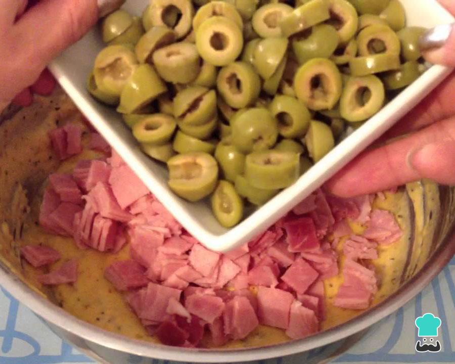 Numa tigela coloque a mistura do liquidificador e acrescente os ingredientes do recheio: o presunto, o queijo e as azeitonas. Envolva bem e tempere com sal e pimenta a gosto.