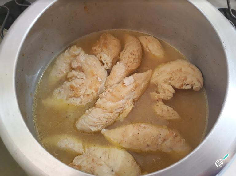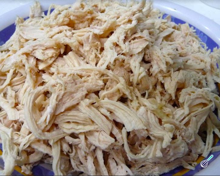 Quando o frango estiver pronto você deve escorrer a água e esperar que a panela esfrie. Feche a panela novamente e chacoalhe por uns 5 minutos, para que o frango desfie facilmente por si mesmo.