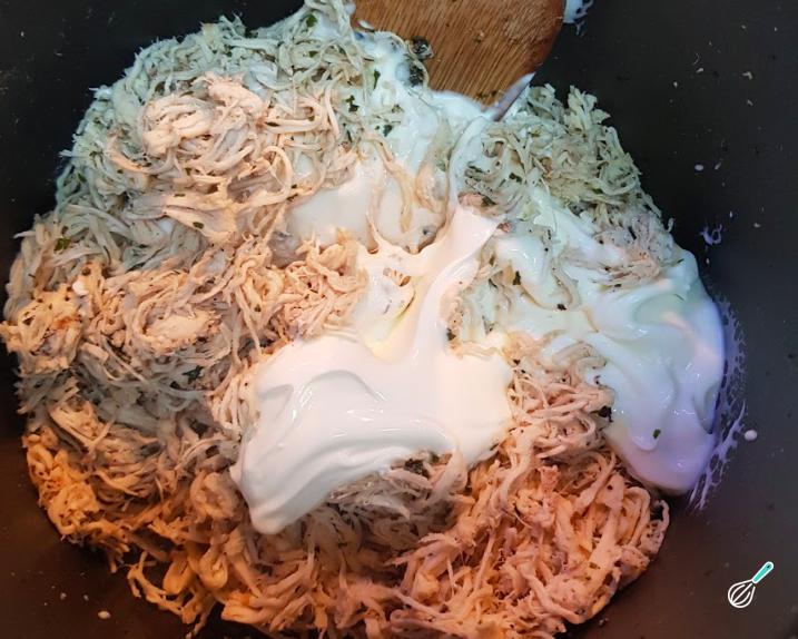 Em seguida, em uma frigideira, você deve adicionar um pouco de azeite, o alho e cebola e deixar dourar. Logo adicione o frango desfiado, o cheiro verde e cozinhe por uns 5 minutos. Por último, adicione o requeijão, o milho, sal e pimenta-do-reino a gosto.