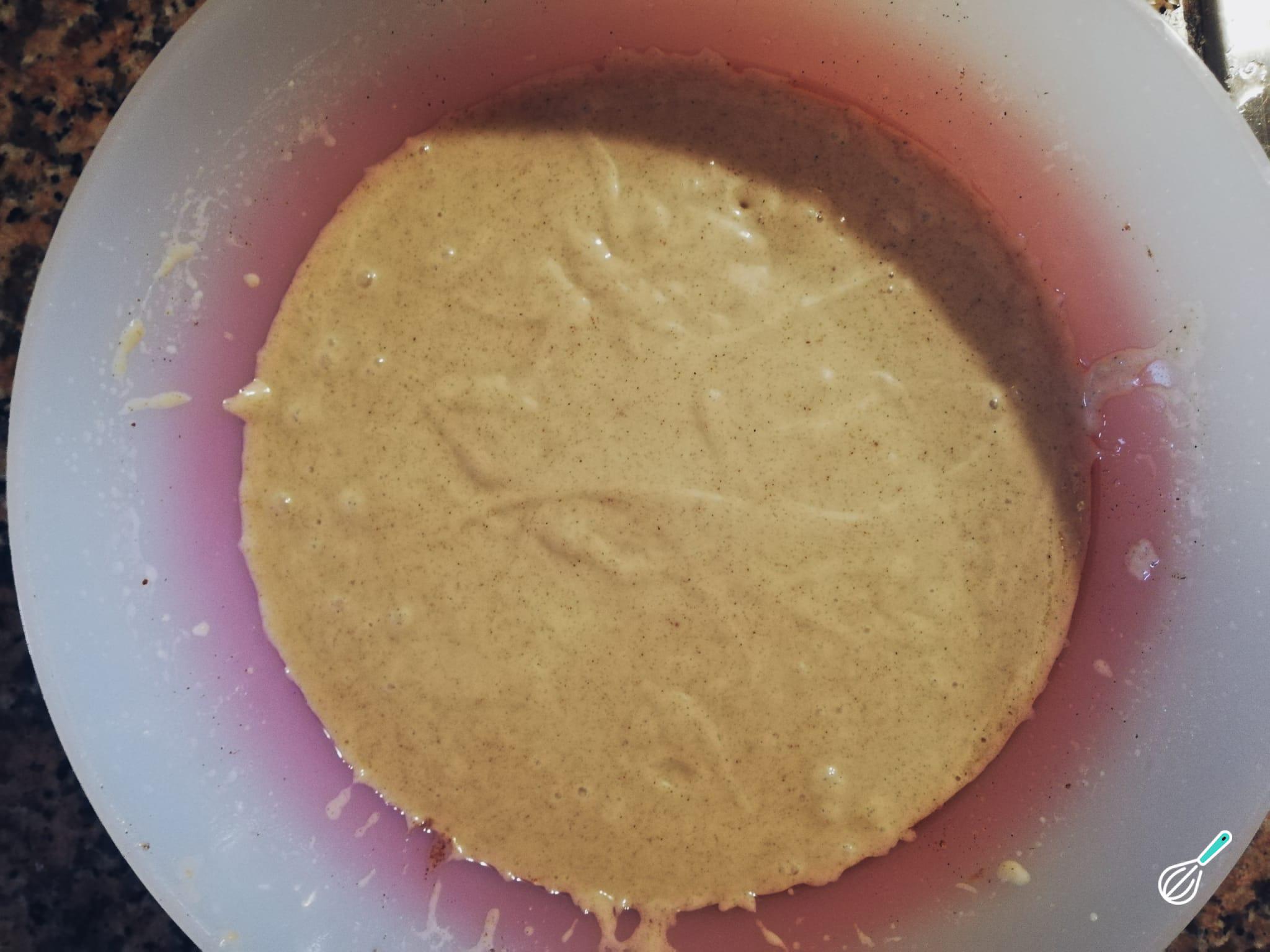 Depois acrescente a banana amassada e continue mexendo até a massa ficar homogênea. Em último lugar acrescente o fermento e misture levemente.