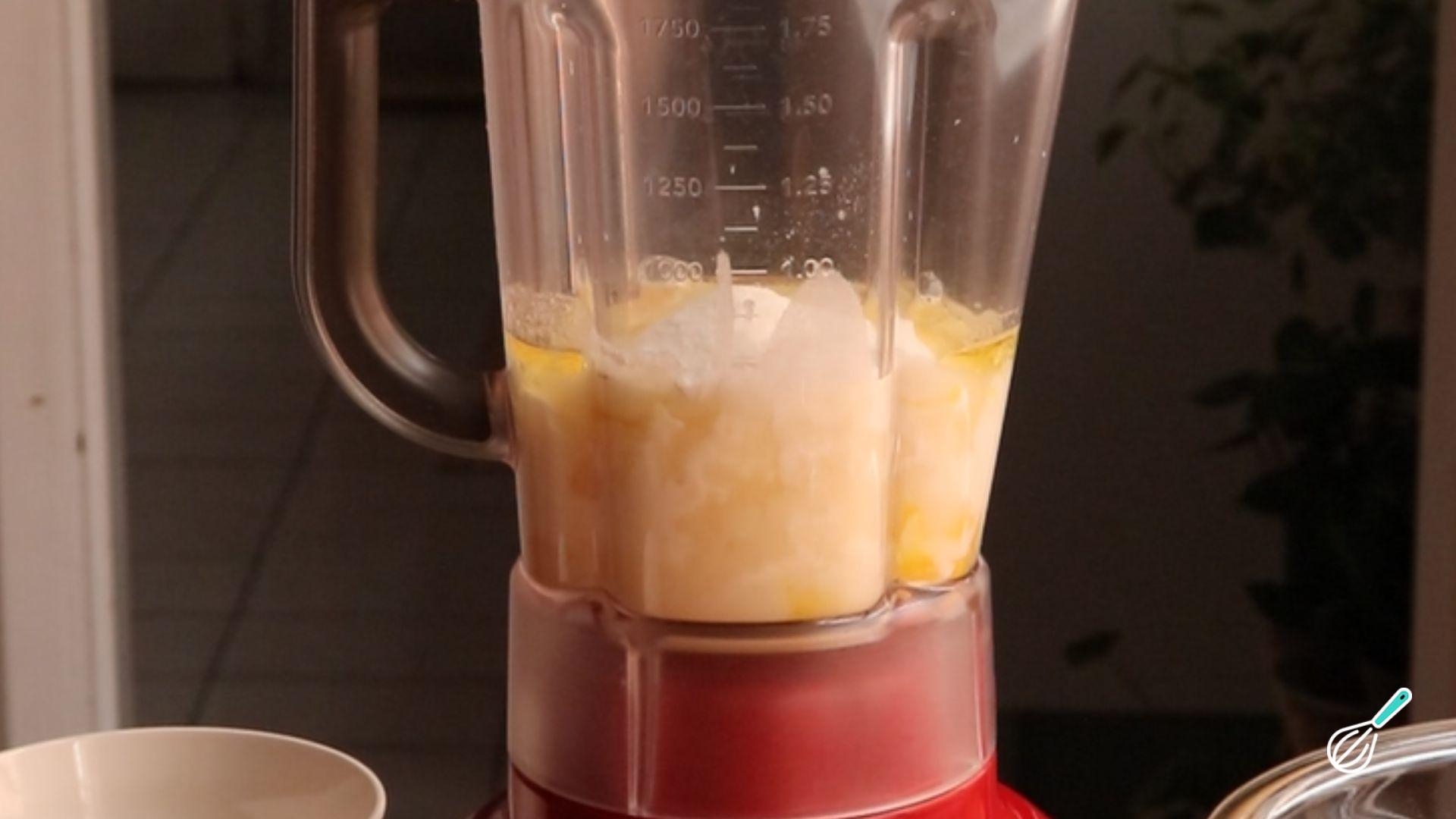 Bata no liquidificador os ovos, o açúcar, o óleo e o leite.