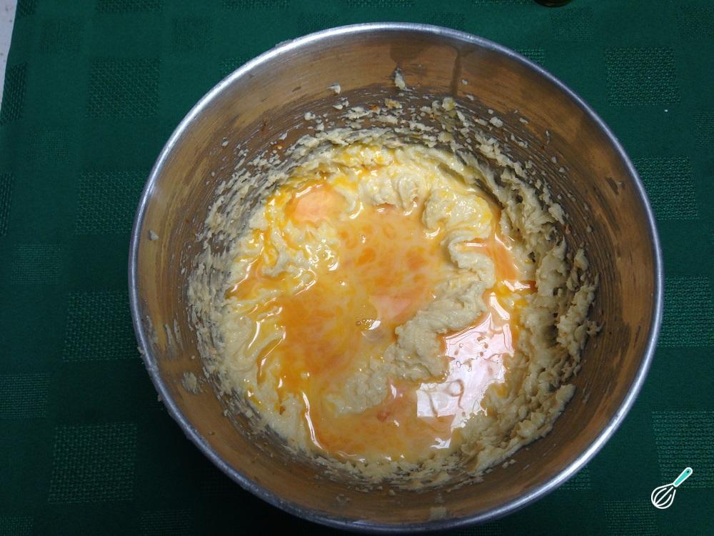 Em seguida adicione os ovos alternando com a farinha peneirada. Bata bem, para se certificar de que a massa não fica com grumos.