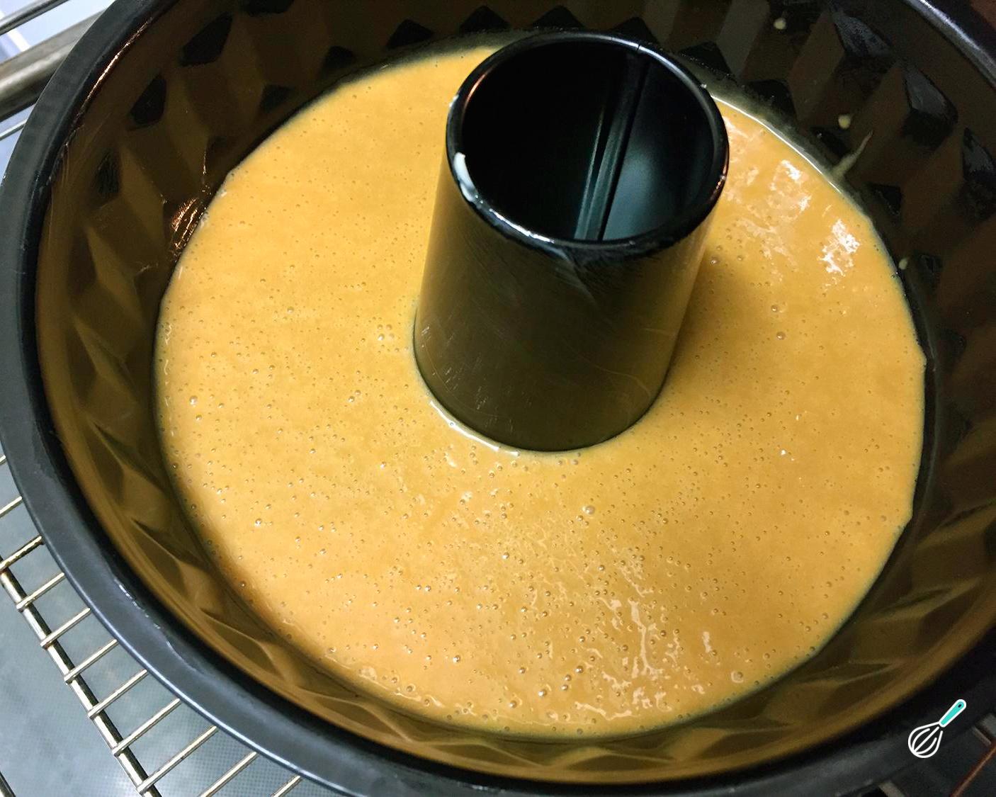 Coloque a mistura em uma forma redonda com furo no meio, previamente untada com um pouco de manteiga. Leve ao forno pré-aquecido a 180ºC por 35 minutos ou até firmar (faça o teste do palito para ter a certeza que o bolo está pronto).