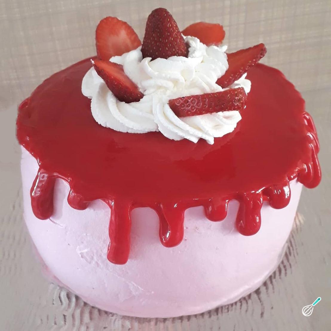 Derrame a calda anterior no centro do topo do bolo. Novamente com a ajuda da espátula, espalhe a calda por todo o topo e deixe escorrer naturalmente nas laterais do bolo. Decore o topo com chantilly e morangos frescos.