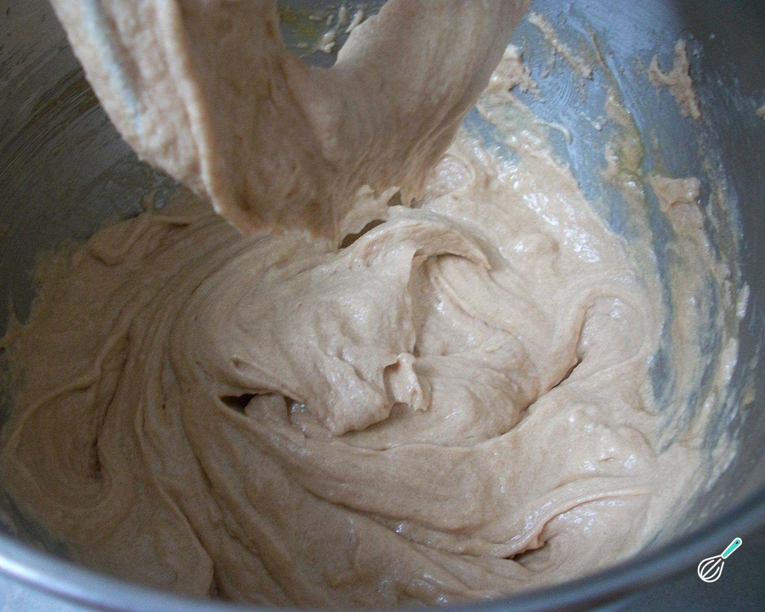 Peneire o chocolate e a farinha num bowl e adicione metade desses secos no creme anterior. Misture bem com um batedor manual/fouet e coloque metade da água. Volte a misturar com o batedor e repita, colocando a restante farinha e água.