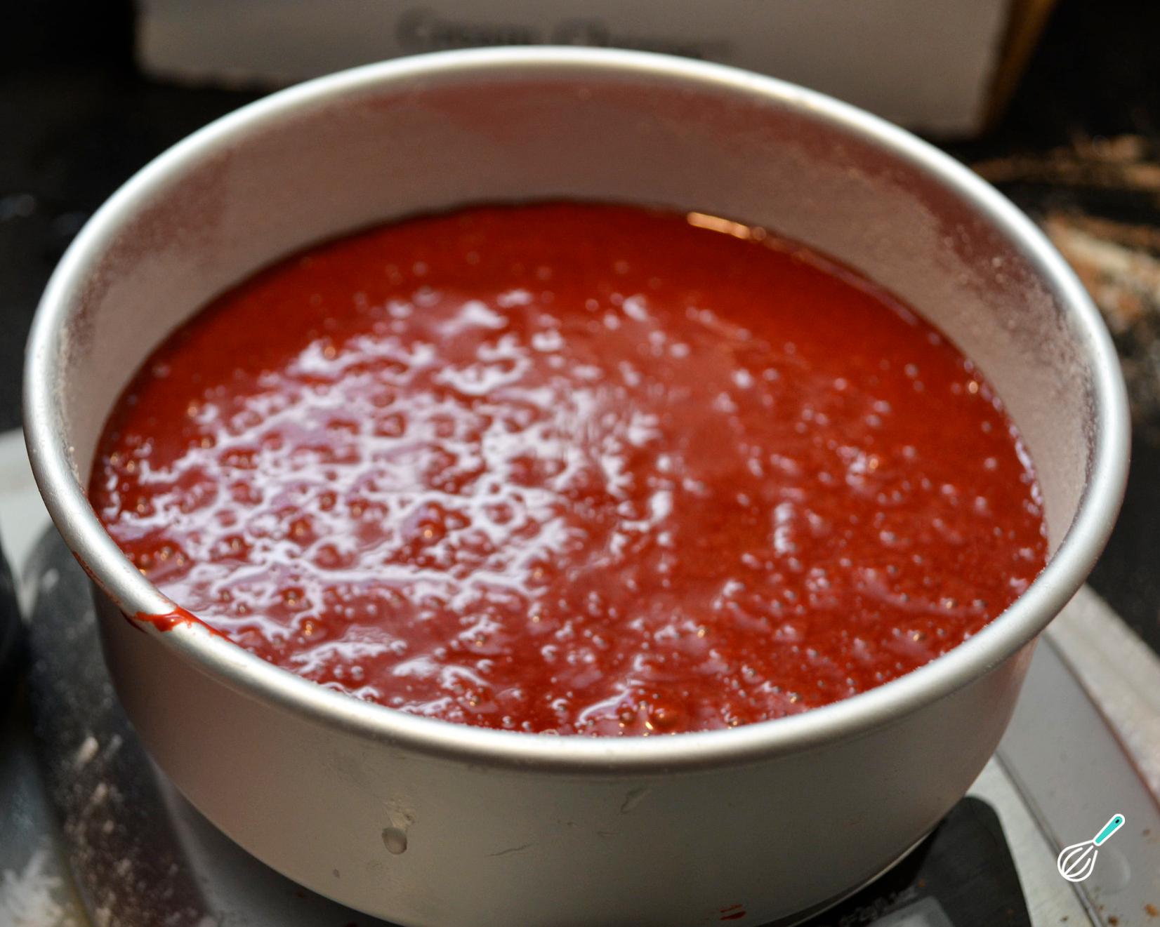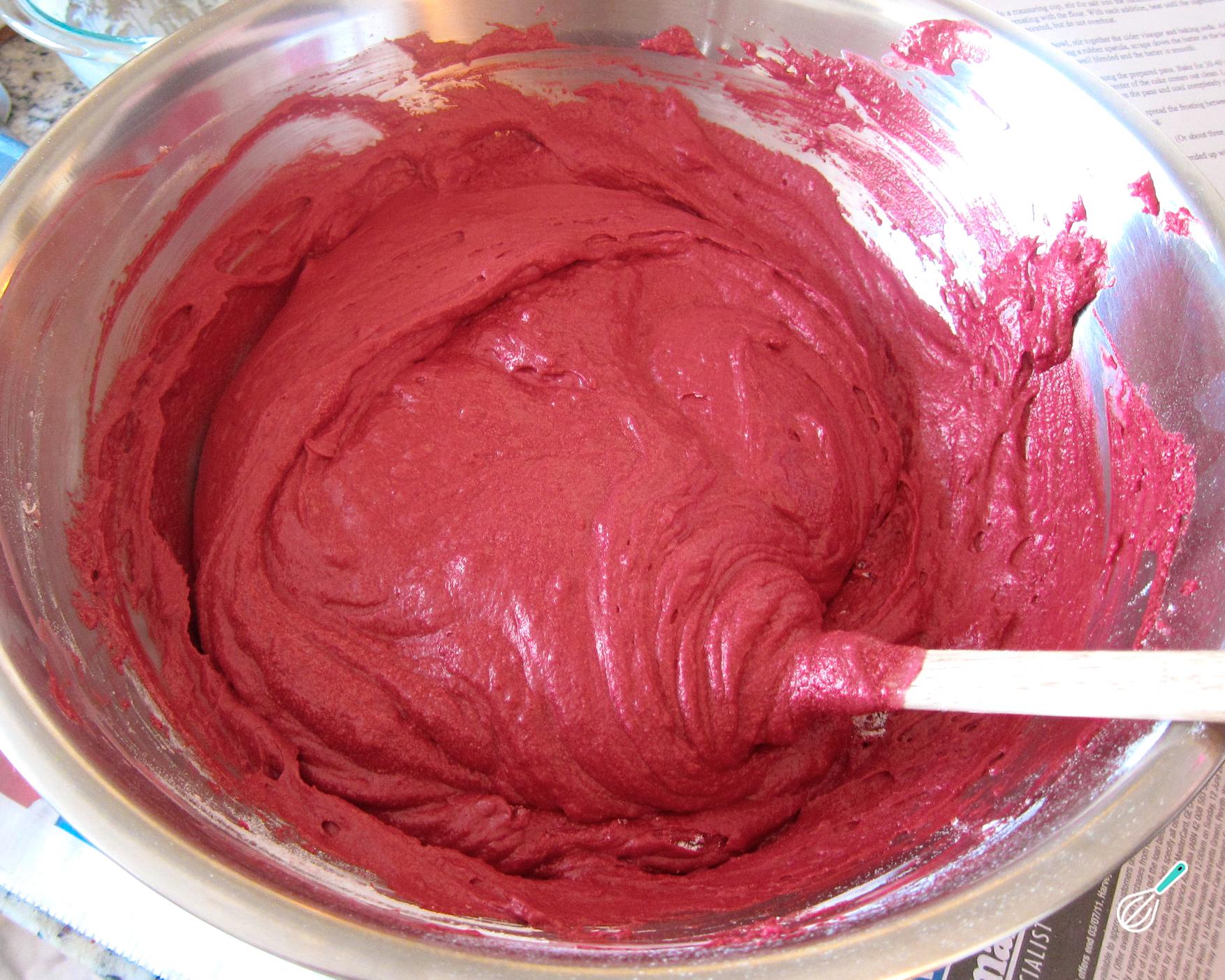 Mexa bem a massa, para dissolver todos os grumos. Depois coloque o fermento e mexa levemente. Por fim adicione o corante em gel vermelho e misture bem, atétingir completamente a massa deste bolo da Maria da Paz.