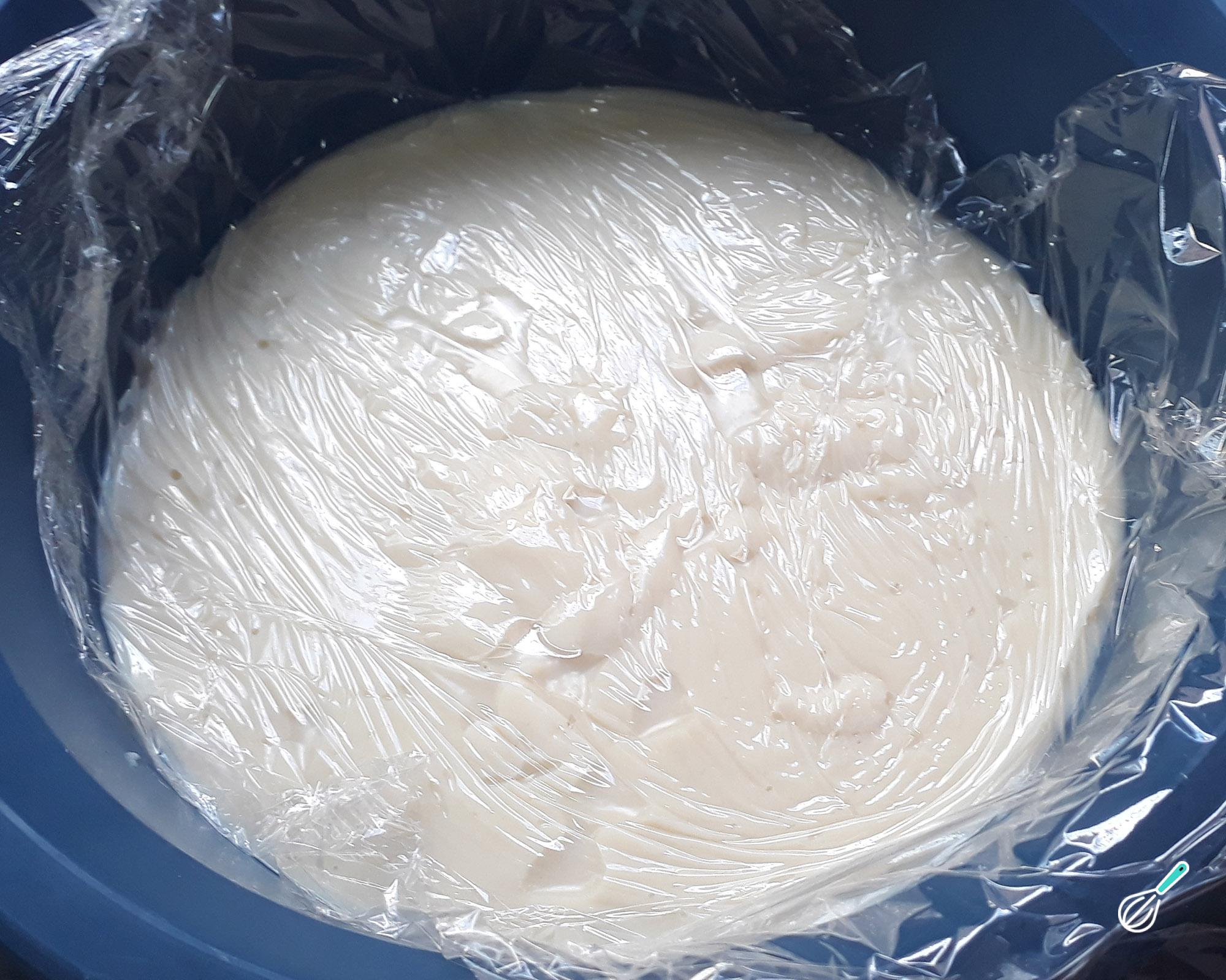 Transfira esse creme para uma vasilha e cubra com plástico filme, para evitar que se forme uma película dura no topo. Deixe esfriar completamente.