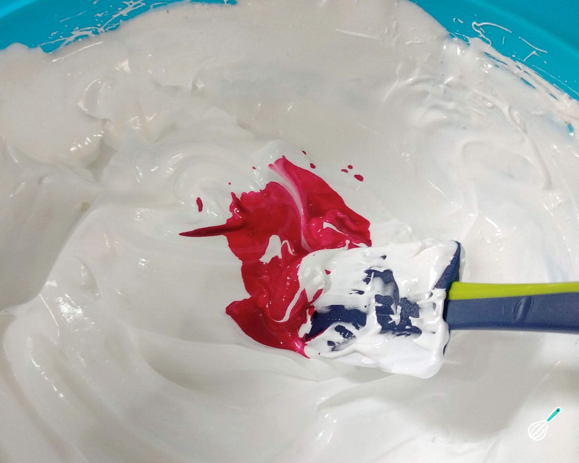 Enquanto isso, prepare a cobertura simplesmente batendo o creme de chantilly até ficar consistente. Coloque o corante e misture com uma espátula até tingir completamente em tom de rosa. Reserve na geladeira até à hora de usar.