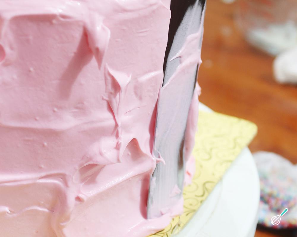 Depois de esfriar bem o bolo, desenforme e cubra o topo e as laterais com o chantilly rosa, de preferência usando uma espátula. Espalhe bem, de forma a conseguir uma cobertura lisinha.