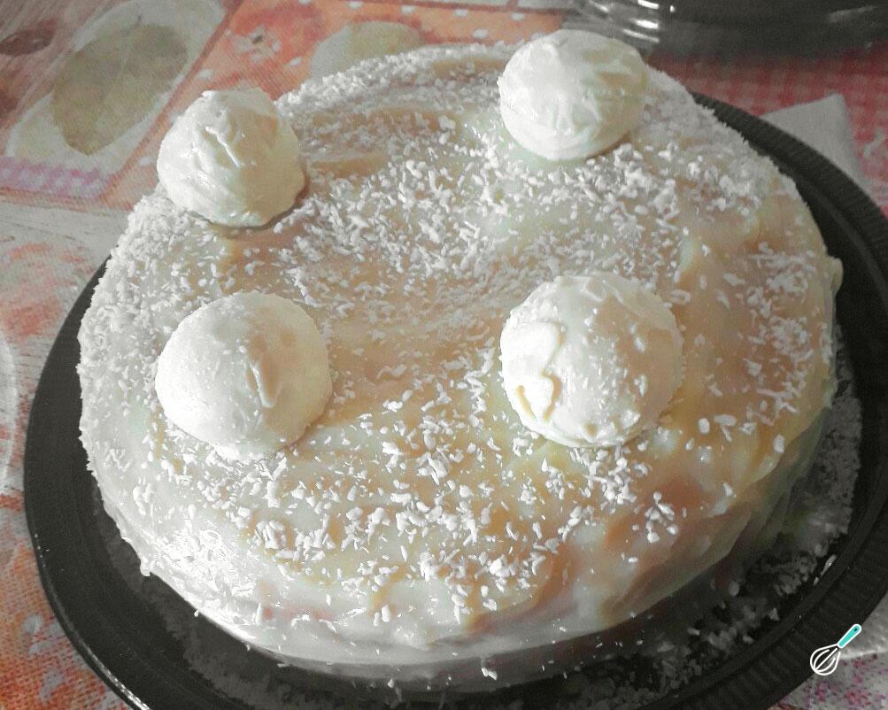 Pegue o recheio e comece colocando no furo do bolo, depois espalhe no restante do bolo. Jogue coco ralado por cima e enfeite com os bombons. Seu bolo vulcão de coco está pronto! Delicie-se com este bolo bem guloso e diga nos comentários o que achou.