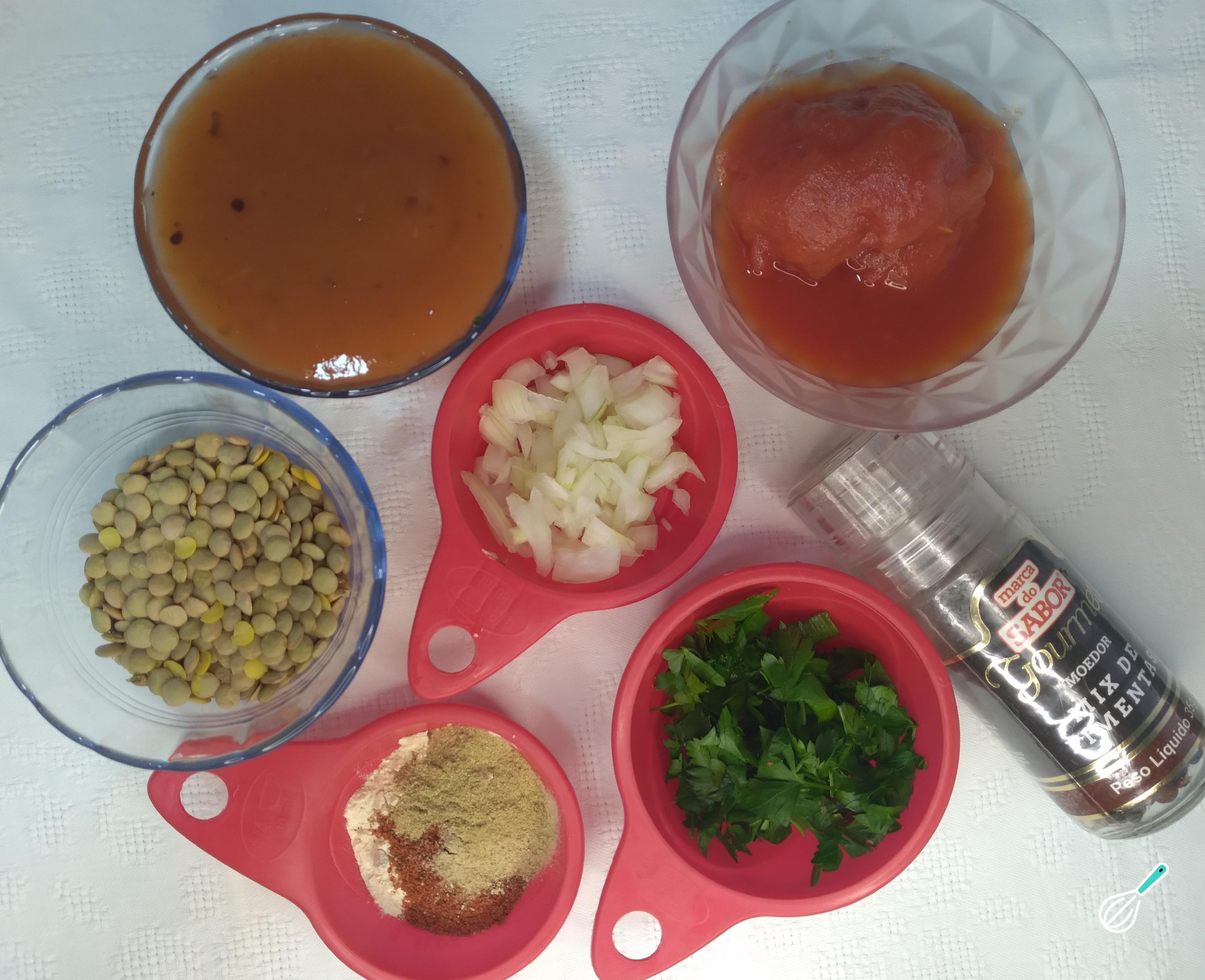Comece separando os ingredientes para o preparo da receita. Corte a cebola em cubos pequenos. A cebolinha e salsinha corte em pequenos pedaços finos. Separe o molho ou extrato de tomate, o tomate pelado e também os temperos de sua preferência. Meça a lentilha. Deixe tudo separadinho para não esquecer nenhum ingrediente.