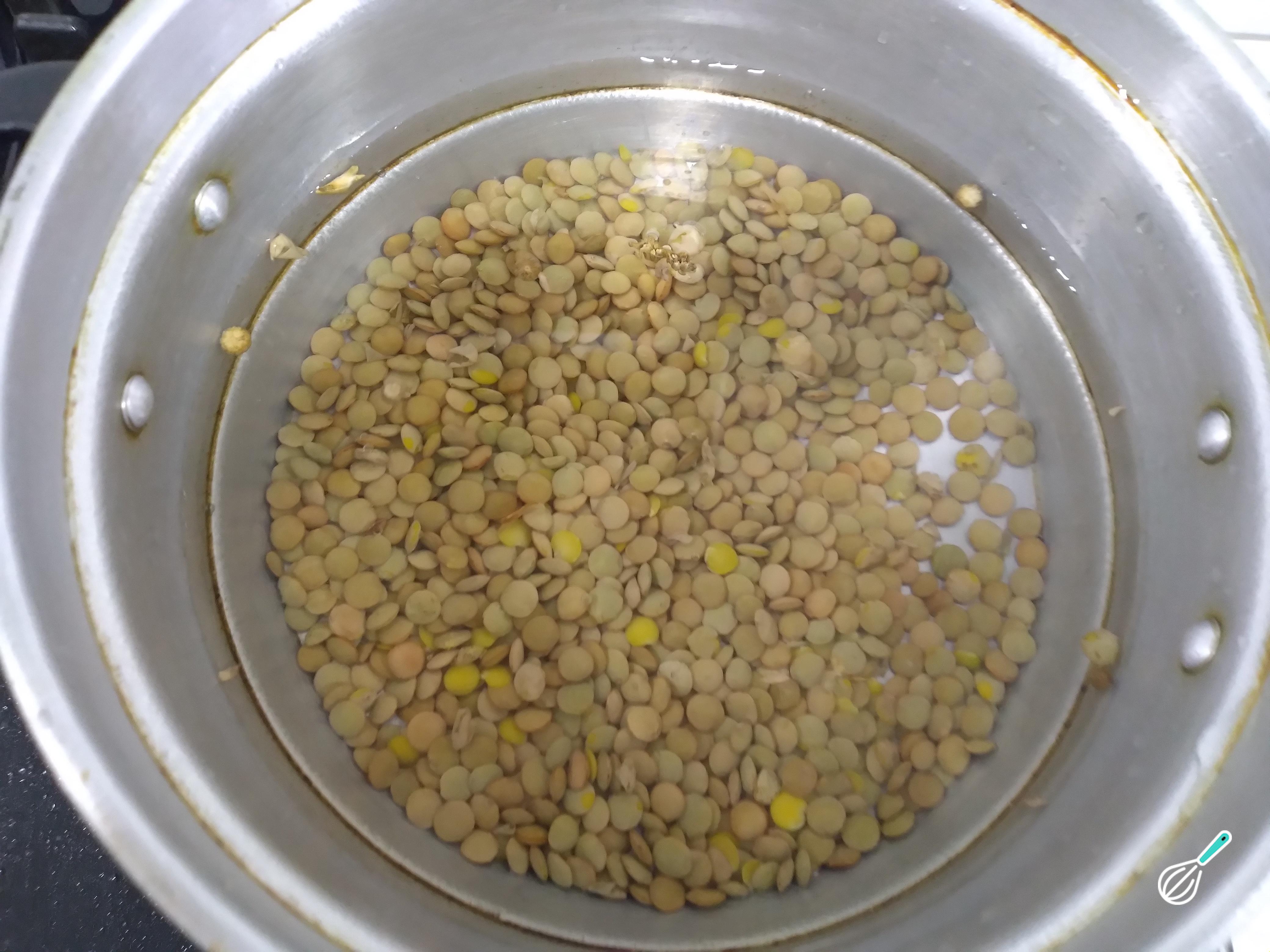Feito isso, coloque as lentilhas de molho em água por no mínimo 4 horas. Depois lave, descarte a água e cozinhe em água fervente por 15 minutos. Coloque em uma panela as lentilhas, cubra com água. Assim que levantar fervura, conte 15 minutos e desligue.
