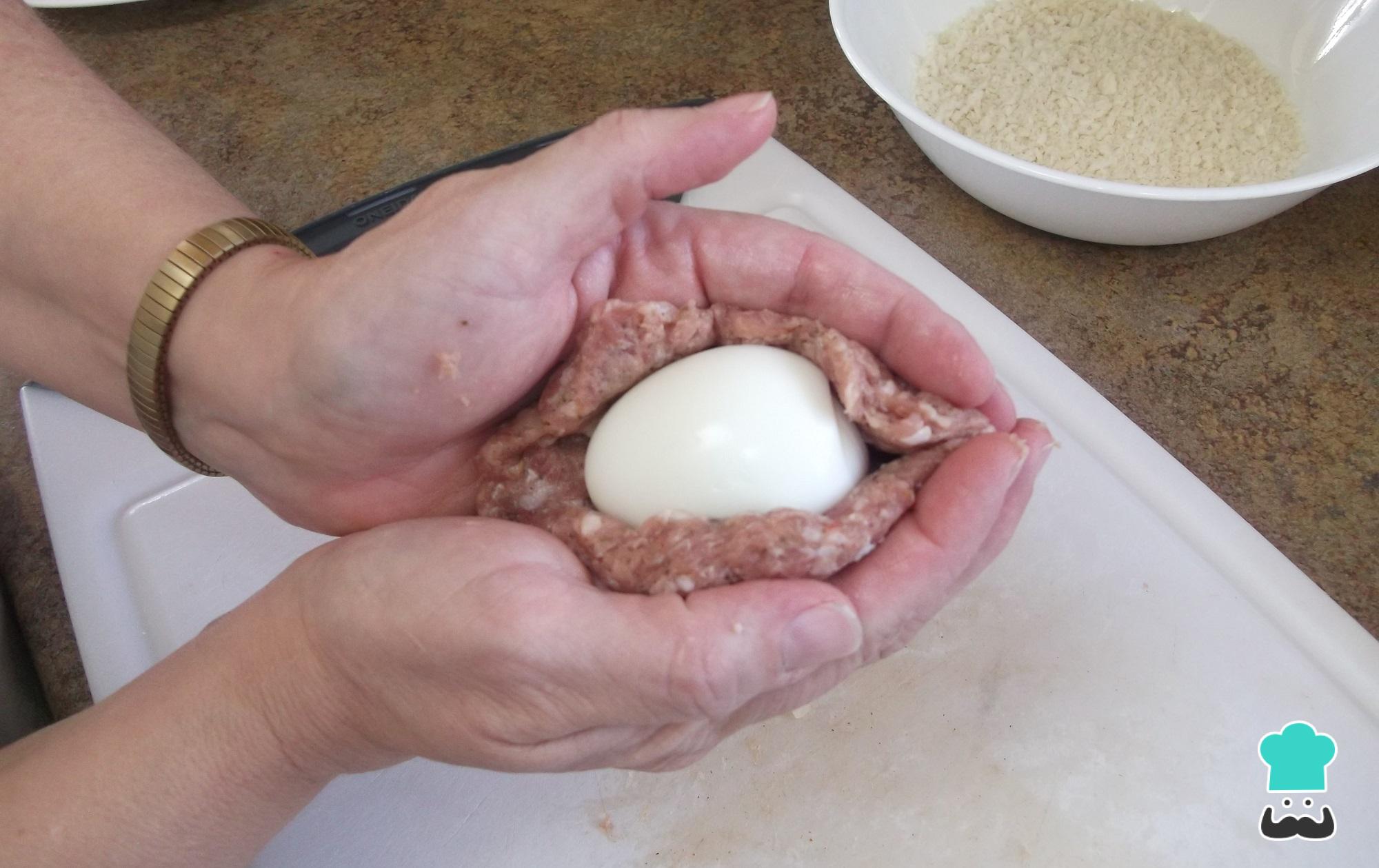 Quando os ovos estiverem cozinhados, retire, coloque em água gelada por 1-2 minutos e descasque. Faça 10 bolinhas com a massa de carne, achate-as entre as palmas das mãos, coloque um ovo no centro e feche bem embrulhadinho.