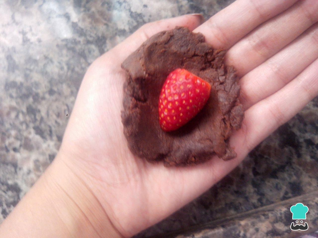 Quando a massa desdes bombons fit estiver durinha separe em duas bolinhas, abra e coloque o morango no meio.