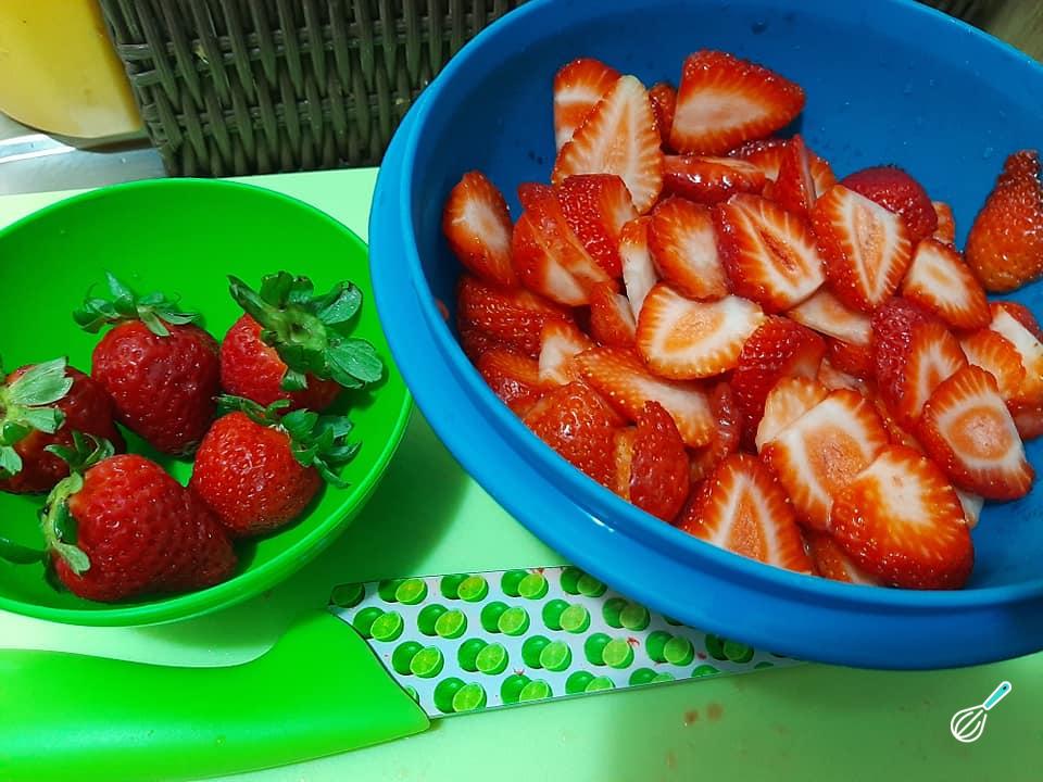 Lave e higienize os morangos. Separe alguns morangos inteiros para a decoração da sobremesa e os demais, corte em fatias. Reserve na geladeira até a hora de usar.