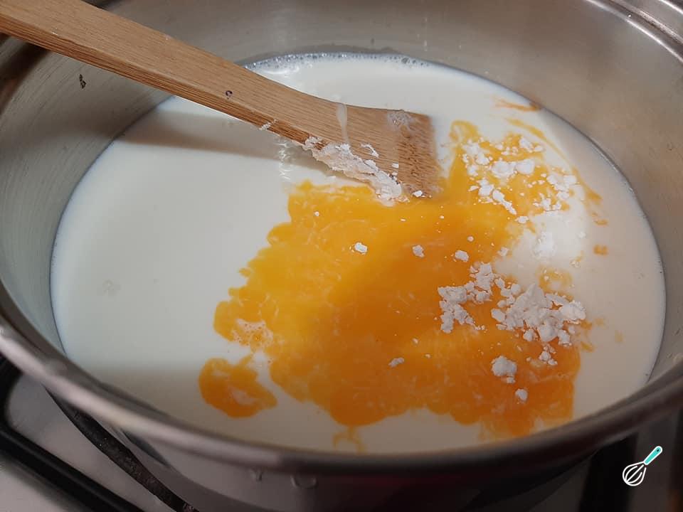 Em uma panela média, leve ao fogo médio os ingredientes do creme: o leite condensado, o leite, o amido de milho, a baunilha e a gema peneirada. Cozinhe mexendo sempre até engrossar.