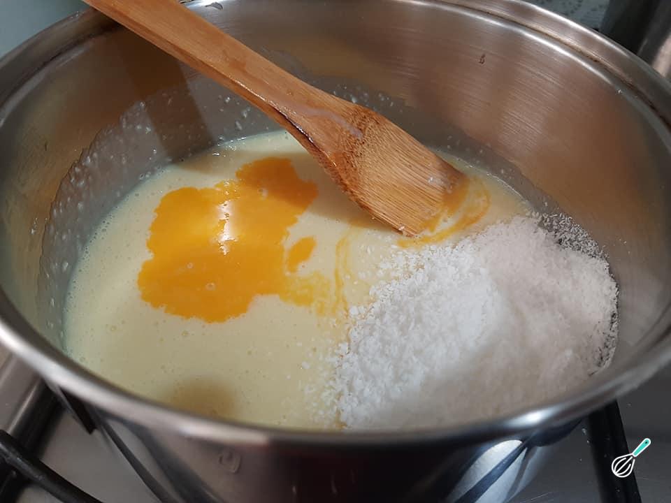 Leve ao fogo baixo os ingredientes do recheio do bombom na travessa: o leite condensado, o coco ralado, a manteiga e a gema peneirada. Misture bem, mexendo sempre para não empelotar.