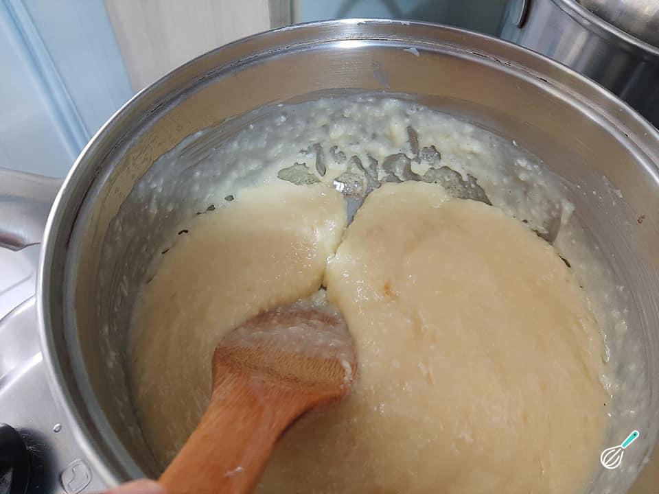 O recheio estará pronto quando estiver cremoso e soltando do fundo da panela, como na foto. Reserve para esfriar um pouco.