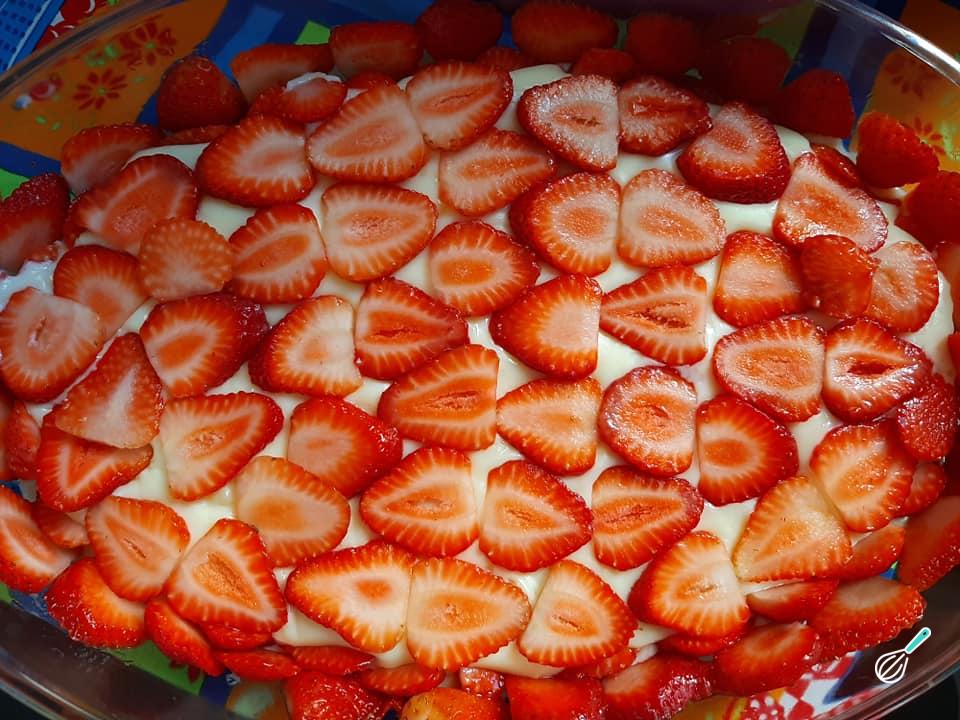 Em seguida acomode as fatias de morangos nas laterias e por cima do creme dentro da travessa.